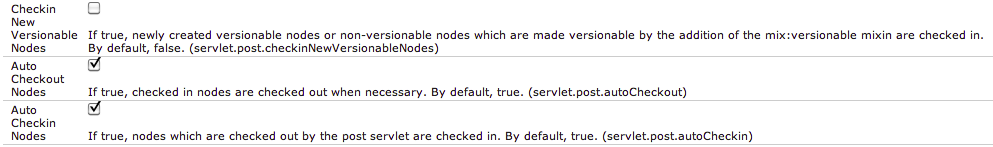 This default behavior can be modified either globally (i.e. for all requests) or on a per-request basis. The global behavior is changed through OSGi ConfigAdmin using these three properties of the PID org.apache.sling.servlets.post.impl.SlingPostServlet