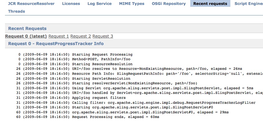 The plugin keeps track of the latest 20 requests processed by Sling, and displays the information provided by the RequestProgressTracker, for the selected request. The screenshot below shows an example.